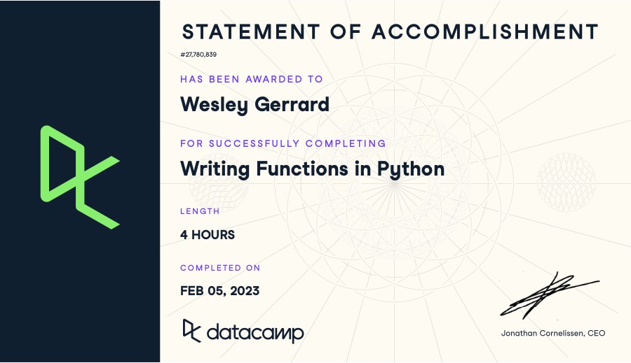 This course, done on Datacamp in conjunction with Masterschool introduced me to writing simple code in Python, a step up from the basic level of computer programming.