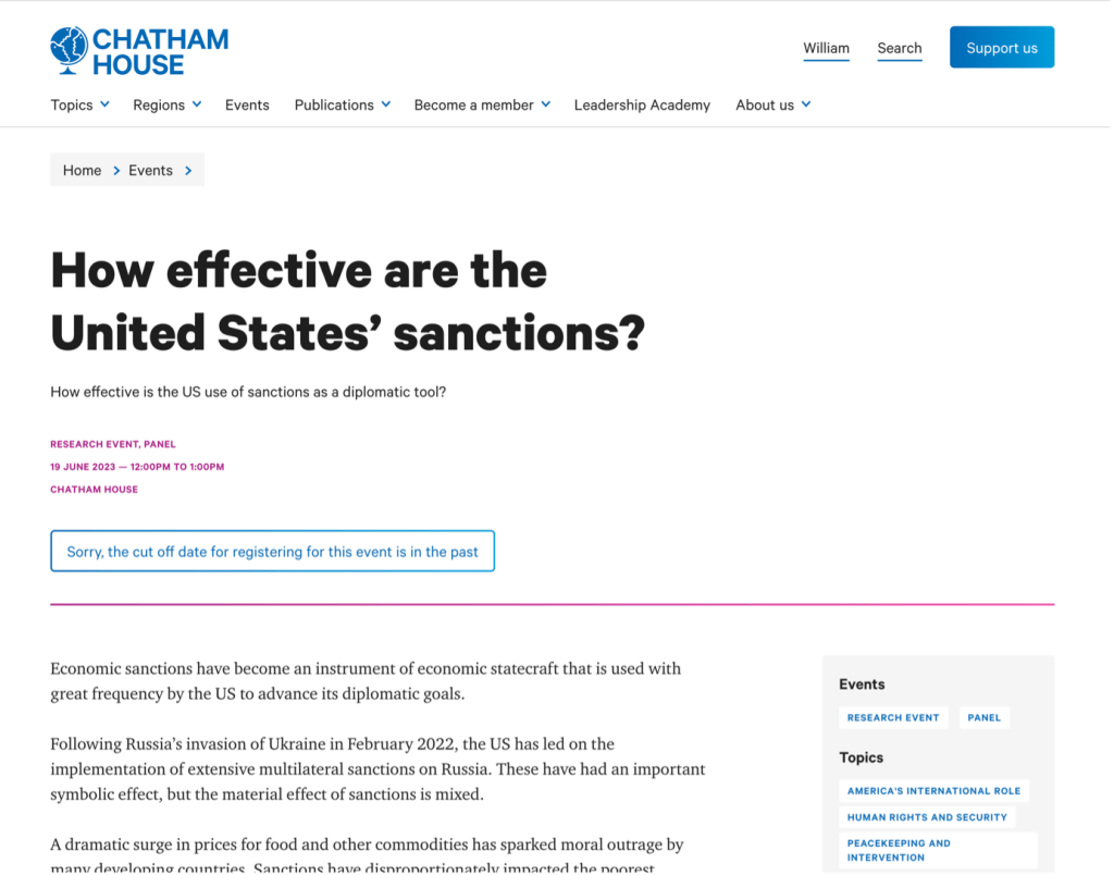 The first event I attended at Chatham House was a pretty intimate round table discussion on US Sanctions. Firstly ,I must say, that I was nervous about going to Chatham House. I’m only a little village hick from a little Welsh border village and at Chatham House I was rubbing shoulders with NATO members, Financial Times & The Economist journalists, powerful international politicians and business leaders etc etc. On reflection from the very outset, Chatham House was probably the most welcoming, inclusive place that I have ever been in my life. If you are a member and haven’t yet been then get there – you’ll love it! If you are not member then sign up and get involved. It’s about the same price as subscribing to a magazine. It’s like being in a serious news broadcast but being able to interact directly with what’s happening and affect global policy and change. It is democracy in action. Here are my reflections on my first Chatham House meeting proper: How effective are the United States’ sanctions?