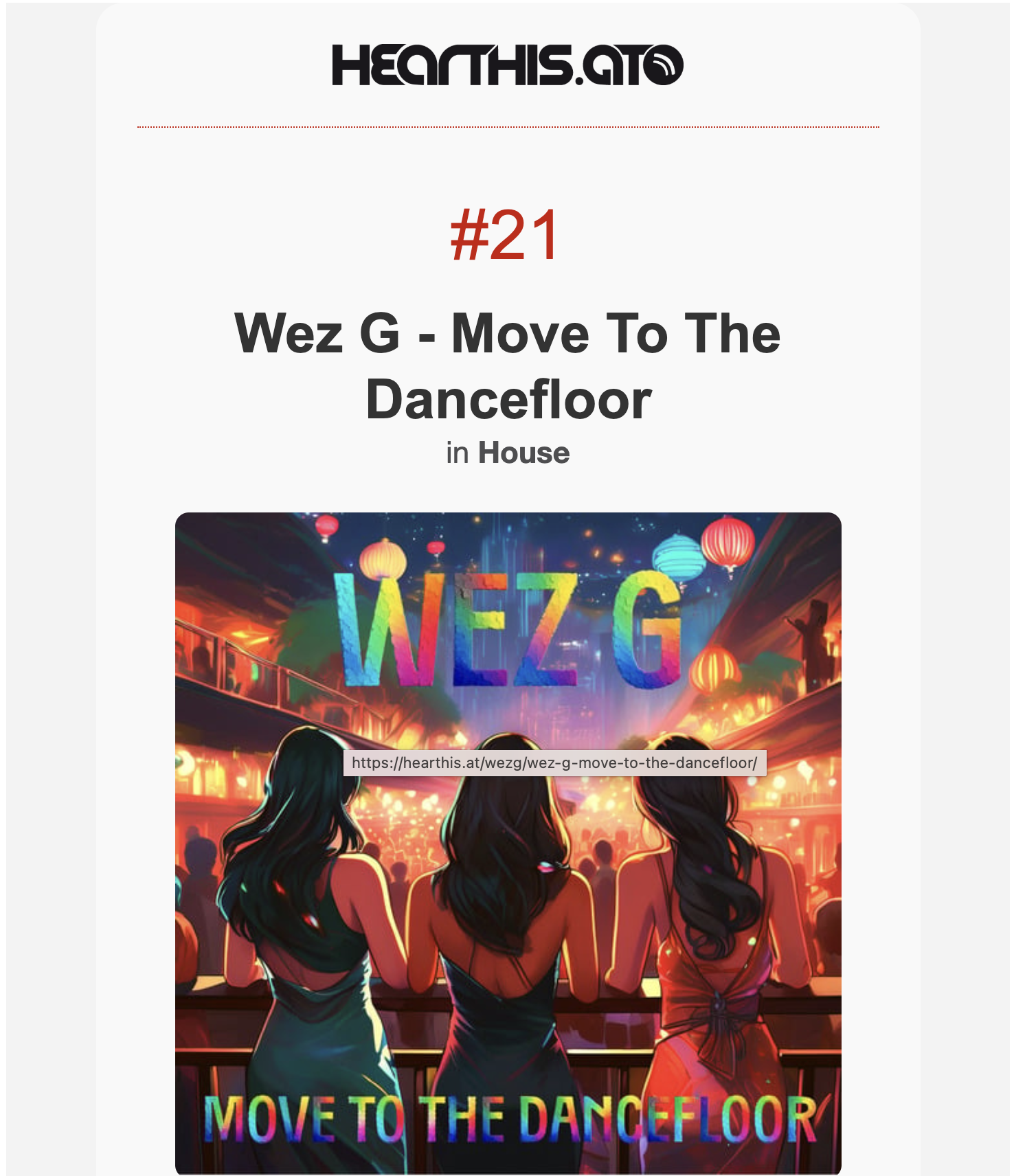 I just had notification that my new release that came out in the digital stores today: Wez G – Move To The Dancefloor – it’s charting well over on the Hearthis.at network, at number 21 in the HOUSE charts there for the week. I have high hopes for this song and it’s had a good reaction from the selected DJs who were sent PROMOS.