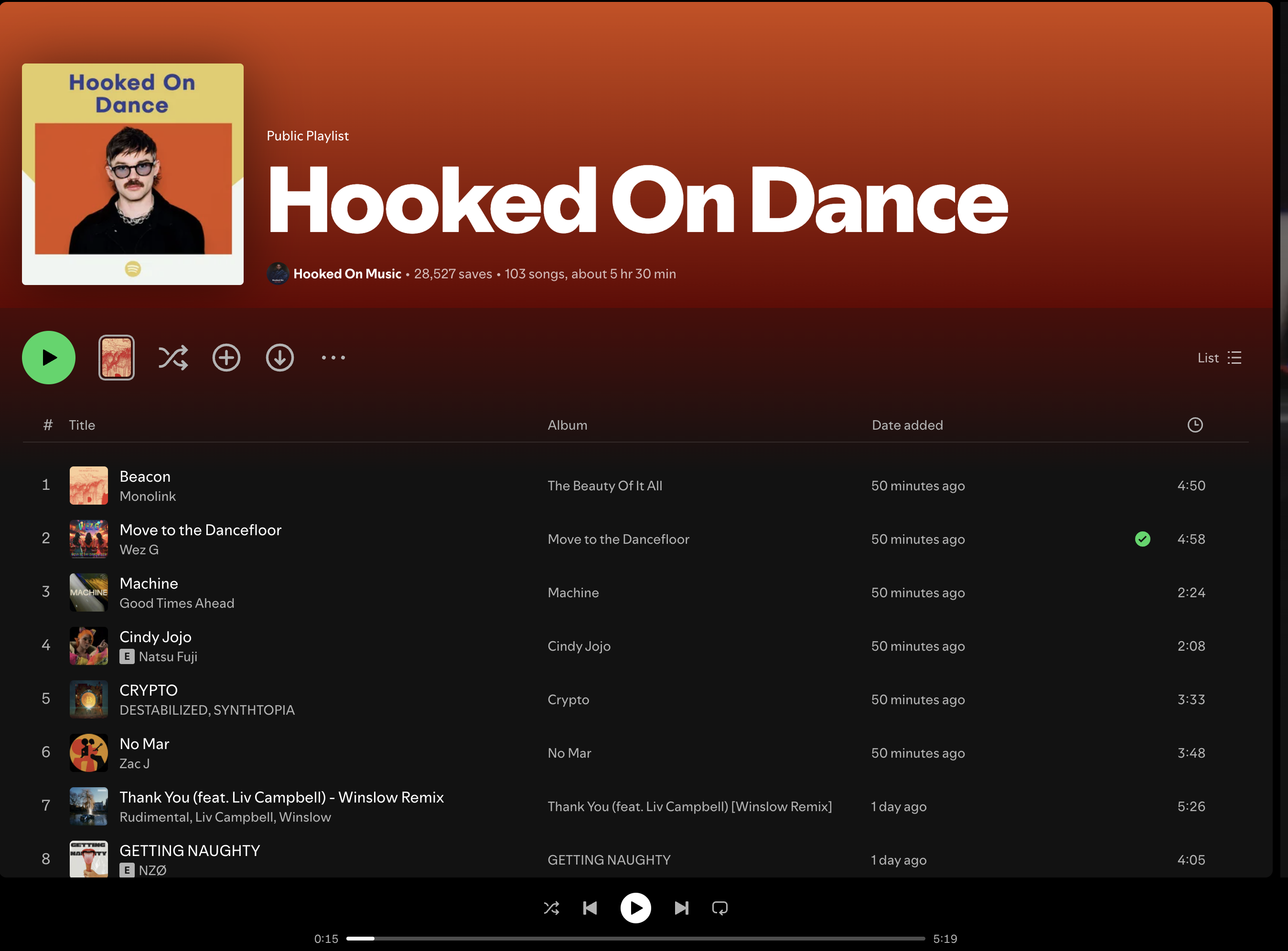 This Hooked on Dance Spotify Playlist is a biggie with 28.5K followers. it’s listed Wez G – Move To The Dancefloor very highly, in second place on its roster so I expect the track to take off a bit on this playlist. Please show your support and check out an industry leading dance music curator.
