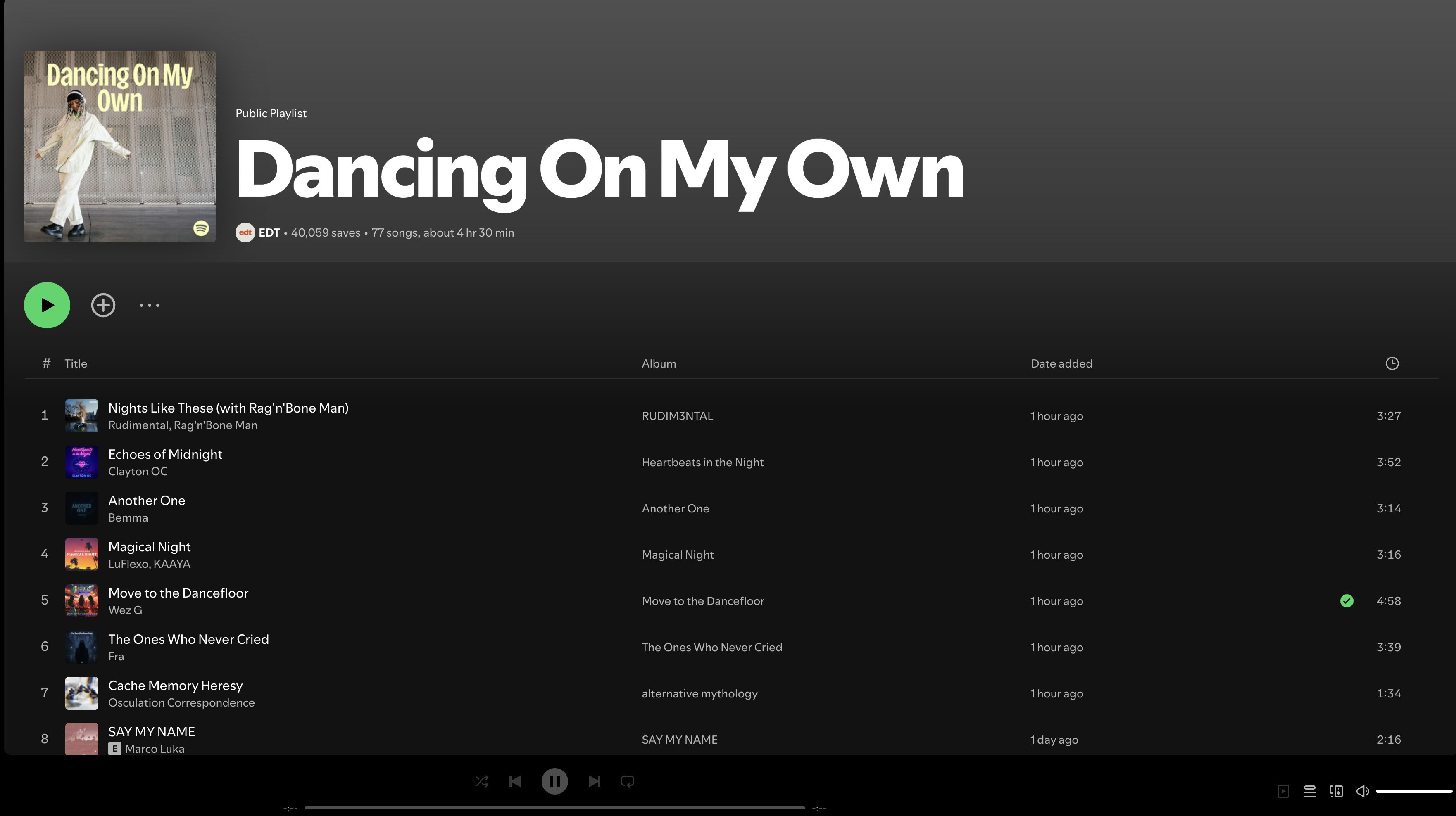 Wez G – Move To The Dancefloor was my second song to pass over 1000 listeners on Spotify earlier. It continues to get strong support and the curator, EDT has added it at a high position of 5 on the Dancing On My Own Spotify Playlist. The list has in excess of 40K subscribers. Please show your support and help to build the Wez G momentum!