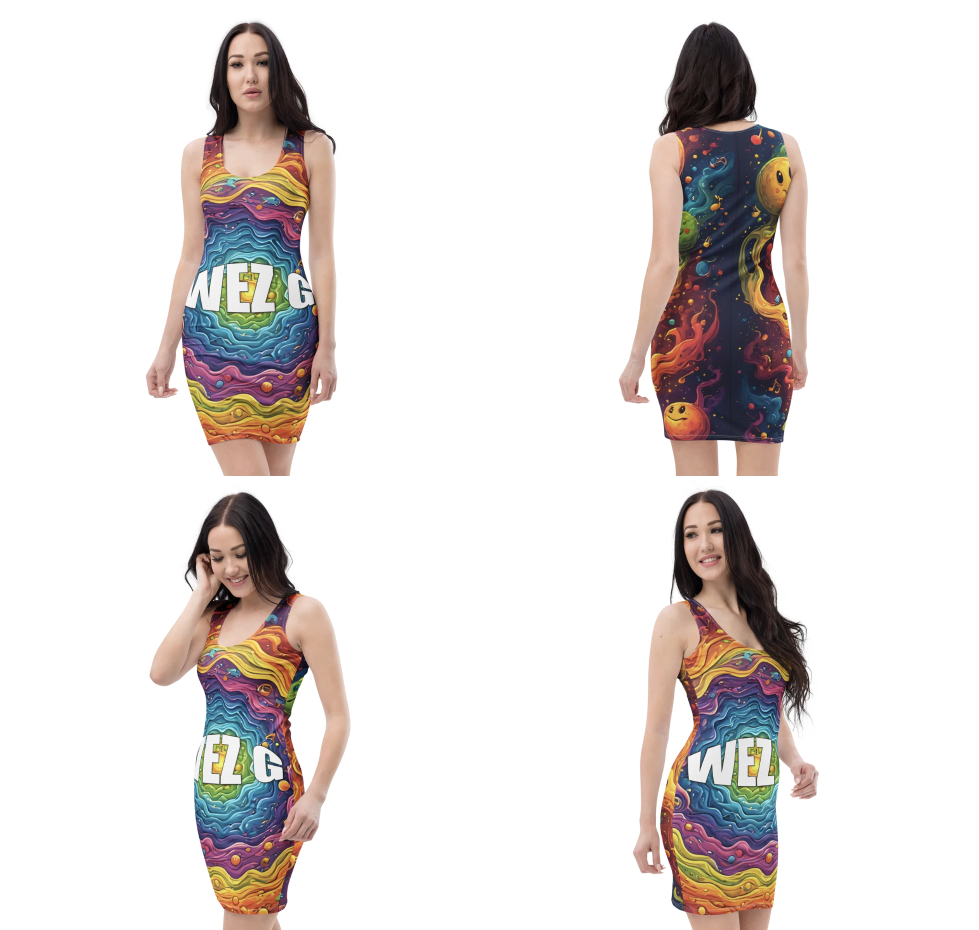 Wez G psychedelic design dress by Cardiff-based artist, Norris Nuvo