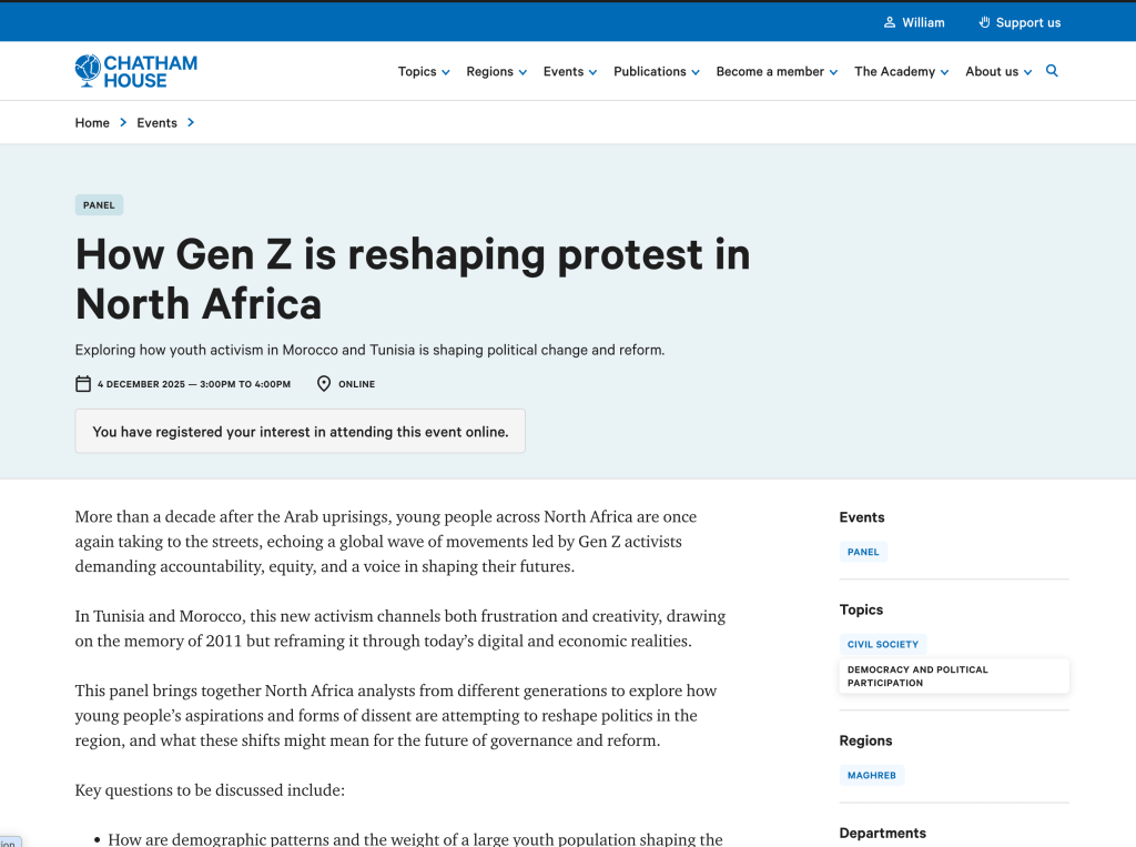 This Chatham House event is chaired by Hayder Al-Shakeri, MENA Programme. On the panel are: Merissa Khurma, CEO AMENA Strategy, Mondher Tounsi, University of Oxford, Nissrine Ait Haji, Entrepreneur and Youth Activist.