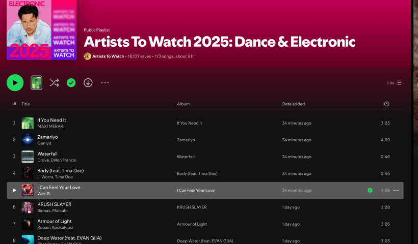 Wez G’s track “I Can Feel Your Love” has been added to the Artists To Watch 2025: Dance & Electronic Spotify Playlist, which has over 18K subscribers. This notable inclusion highlights the rising artist’s growing recognition in the electronic music scene. More details can be found on Wez G’s official website.