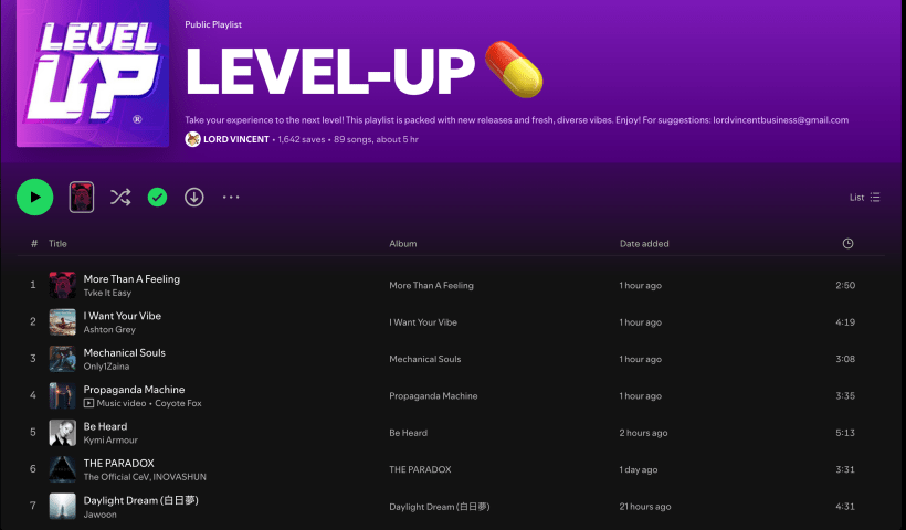 Curator Lord Vincent featured the song “Wez G – Holiday” on his Level-Up Spotify Playlist. Listeners are encouraged to support the playlist by tuning in. For more information, visit the provided links.