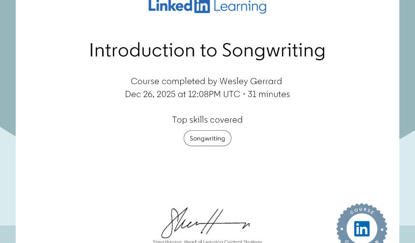 The author, a newcomer to songwriting, completed a LinkedIn Learning course and received a certificate. The course provided insights into songwriting techniques and essential music industry skills, enabling the author to better approach songwriting, maximize potential revenue, and understand future work opportunities in the field.