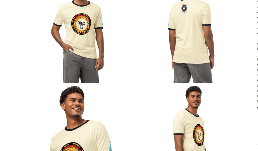 Norris Nuvo designed the Wez G Merchandise Shop’s light yellow unisex t-shirt featuring the Wez G logo on the front, a vinyl record on the back, and Shuffle Man on the left sleeve. This stylish shirt is intended for fans, and there’s hope to see many wearing it soon.